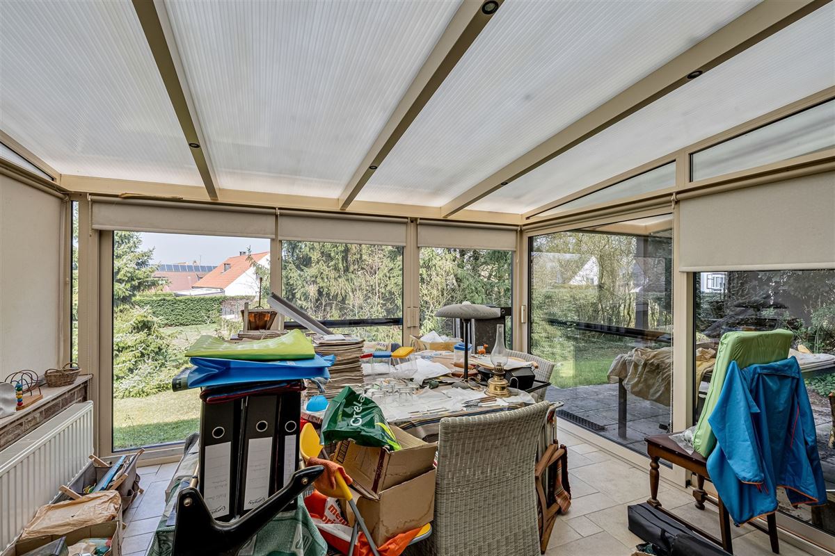 Deze woning heeft een veranda met glazen wanden die een perfecte overgang creëert naar de buitenruimte. Deze veranda is ideaal voor ontspanning en om te genieten van uitzicht op het omringende groen.