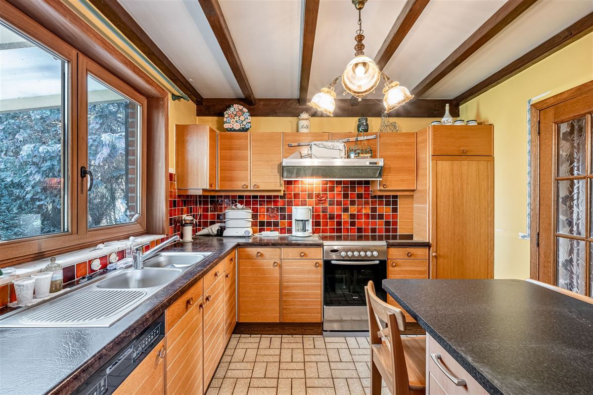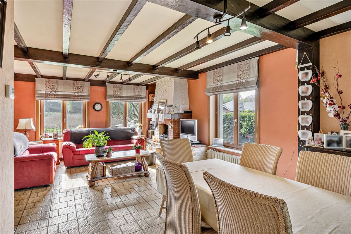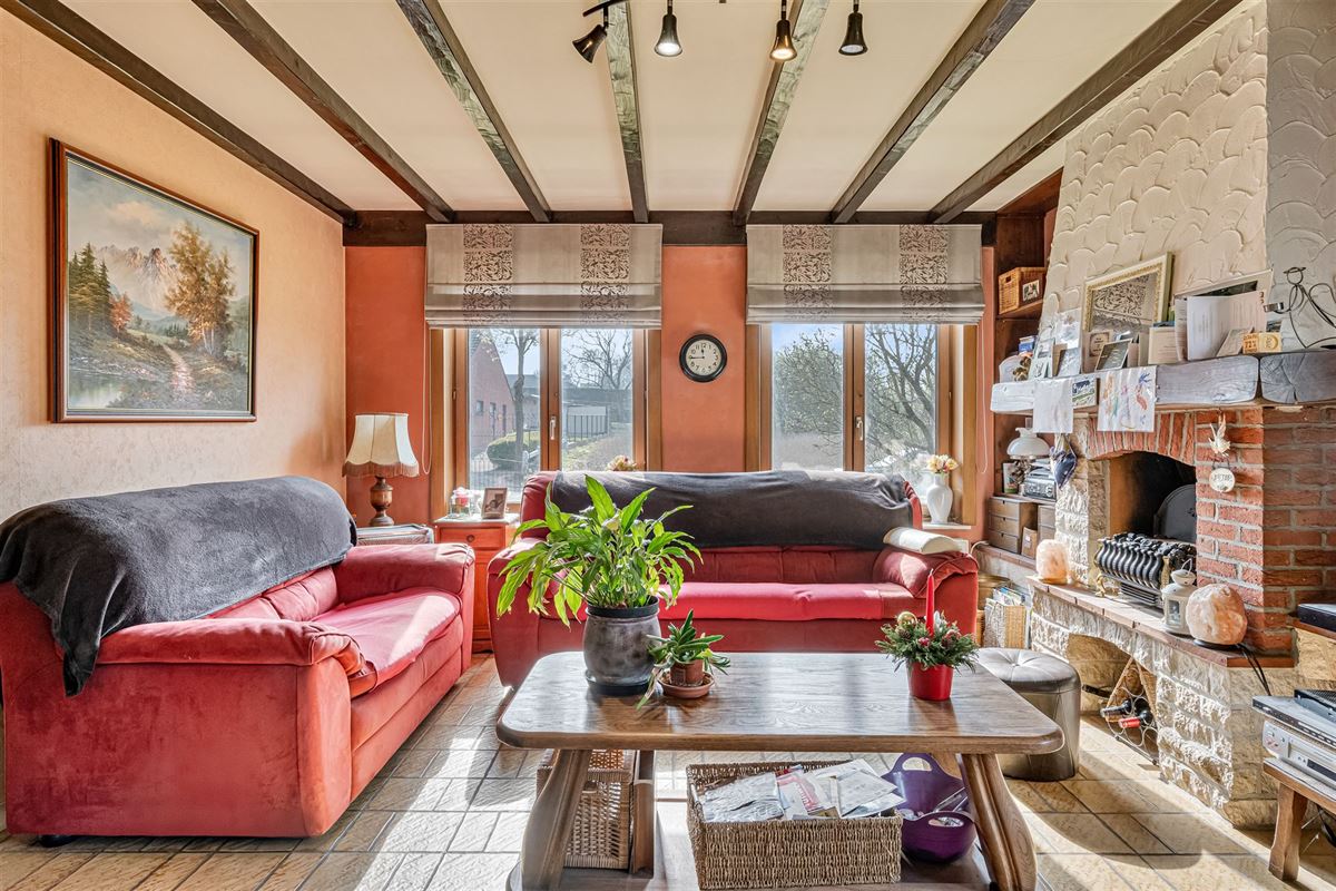 Deze woning bestaat uit een inkomhal met vestiaire en toilet die leidt naar een gezellige woonkamer, het hart van het huis met traditionele houten balkenplafond en een gezellige open haard.